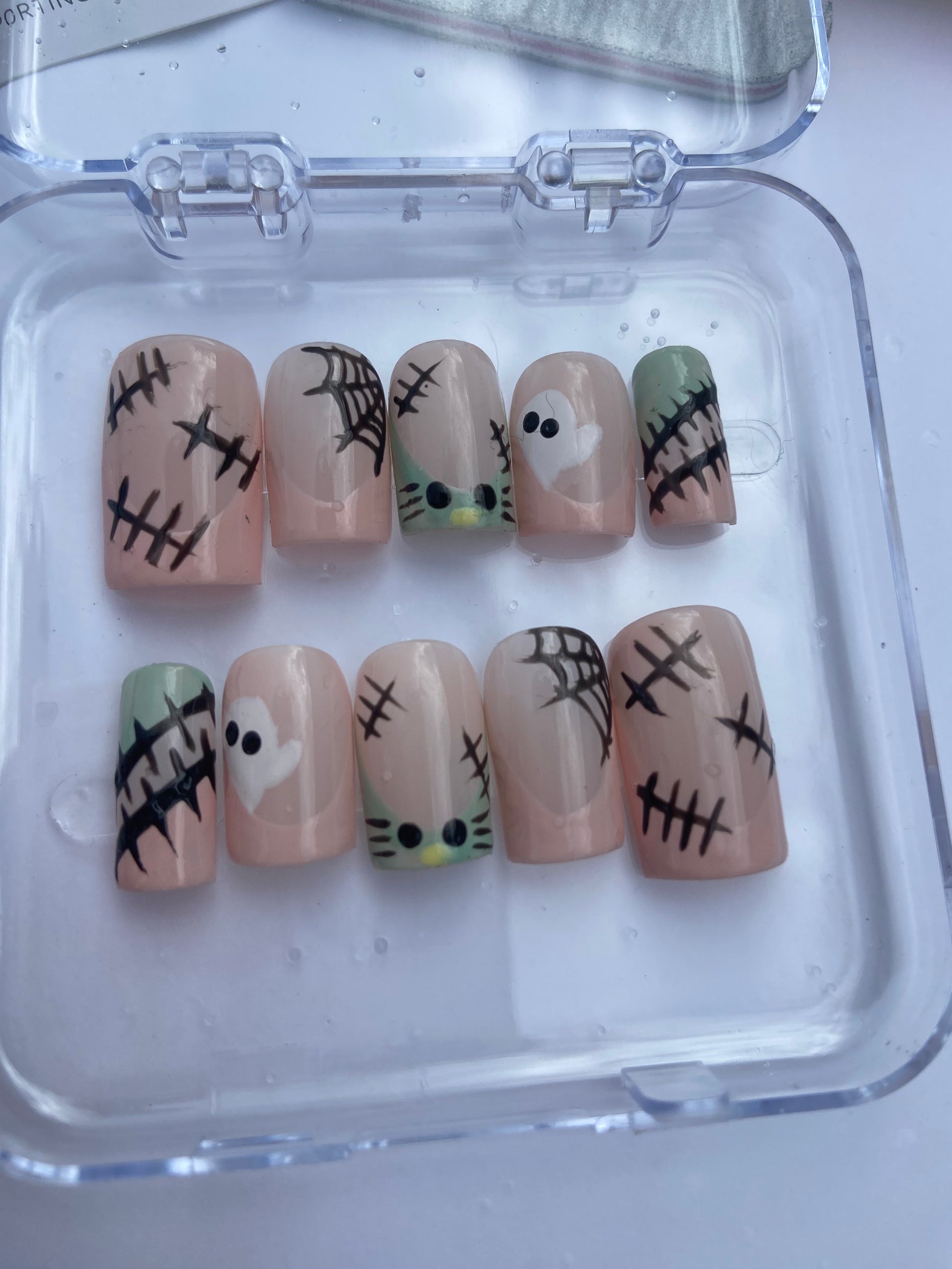This Halloween-themed nail set features a nude base decorated with spooky accents: black stitches, spiderweb details, cute little white ghosts, and green monster Hello Kitty, The mix of creepy-cute designs creates a playful yet spooky vibe, perfect for Halloween